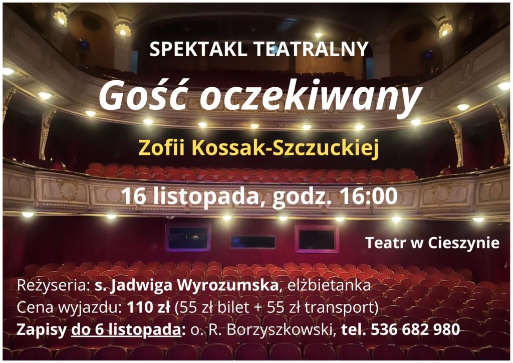 - Trwają jeszcze zapisy na wspólny wyjazd do teatru w Cieszynie na spektakl „Gość oczekiwany” w niedzielę 16 listopada (patrz: Plakat).