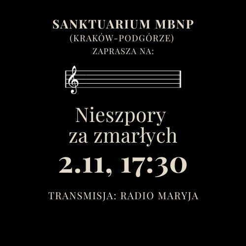 – W naszym sanktuarium rozpoczynamy wspólną wieczorną modlitwę Kościoła czyli Nieszpory transmitowane na żywo przez Radio Maryja sprawowane w każdą niedzielę o godz. 17.30. Dziś w Dzień Zaduszny, będą to Nieszpory za zmarłych. Zapraszamy wszystkich wiernych do udziału w tej modlitwie.